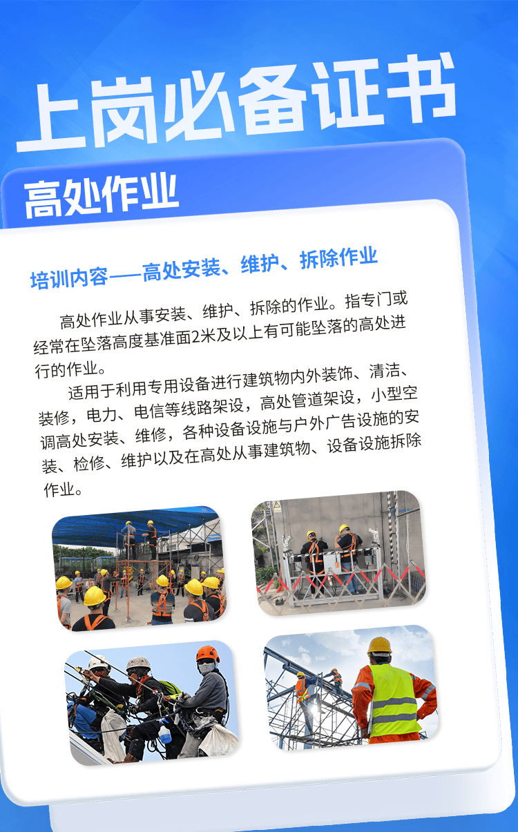 高处作业:指专门或经常在坠落高度基准面2米及以上有可能坠落的高处进行的作业。