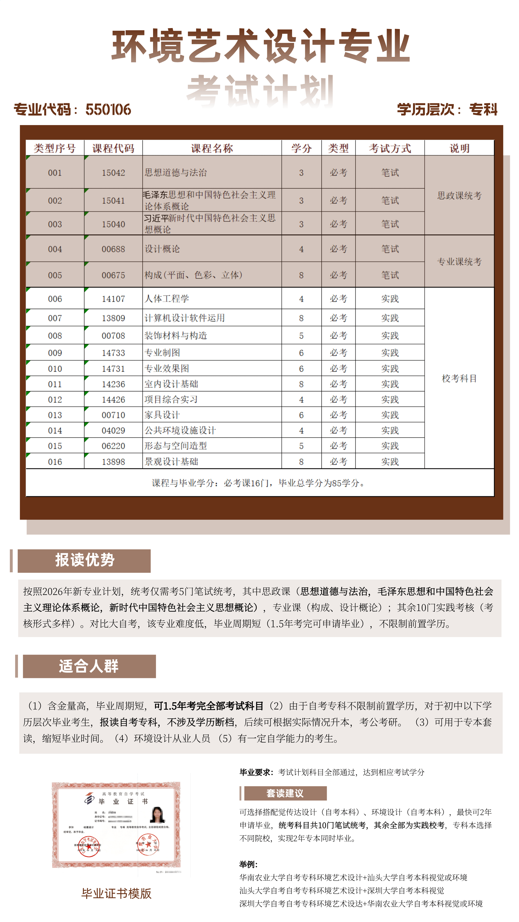 重点:专科仅需参加4-5门笔试统考,其余均为实践考试,视觉和环境专业均为10-13门(含毕业实习)。